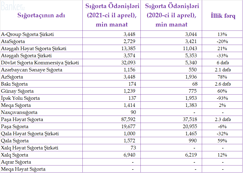 2021-ci ilin aprel ayında Azərbaycanda fəaliyyət göstərən sığorta şirkətindən 11-nin ödənişləri illik müqayisədə artıb, 5-nin ödənişləri azalıb.