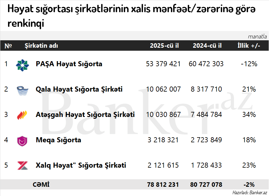 2025-ci ildə Azərbaycanda həyat sığortası şirkətlərinin ümumi xalis mənfəəti 78.8 milyon manat təşkil edib. Bu, 2024-cü illə müqayisədə 2% azalma deməkdir.