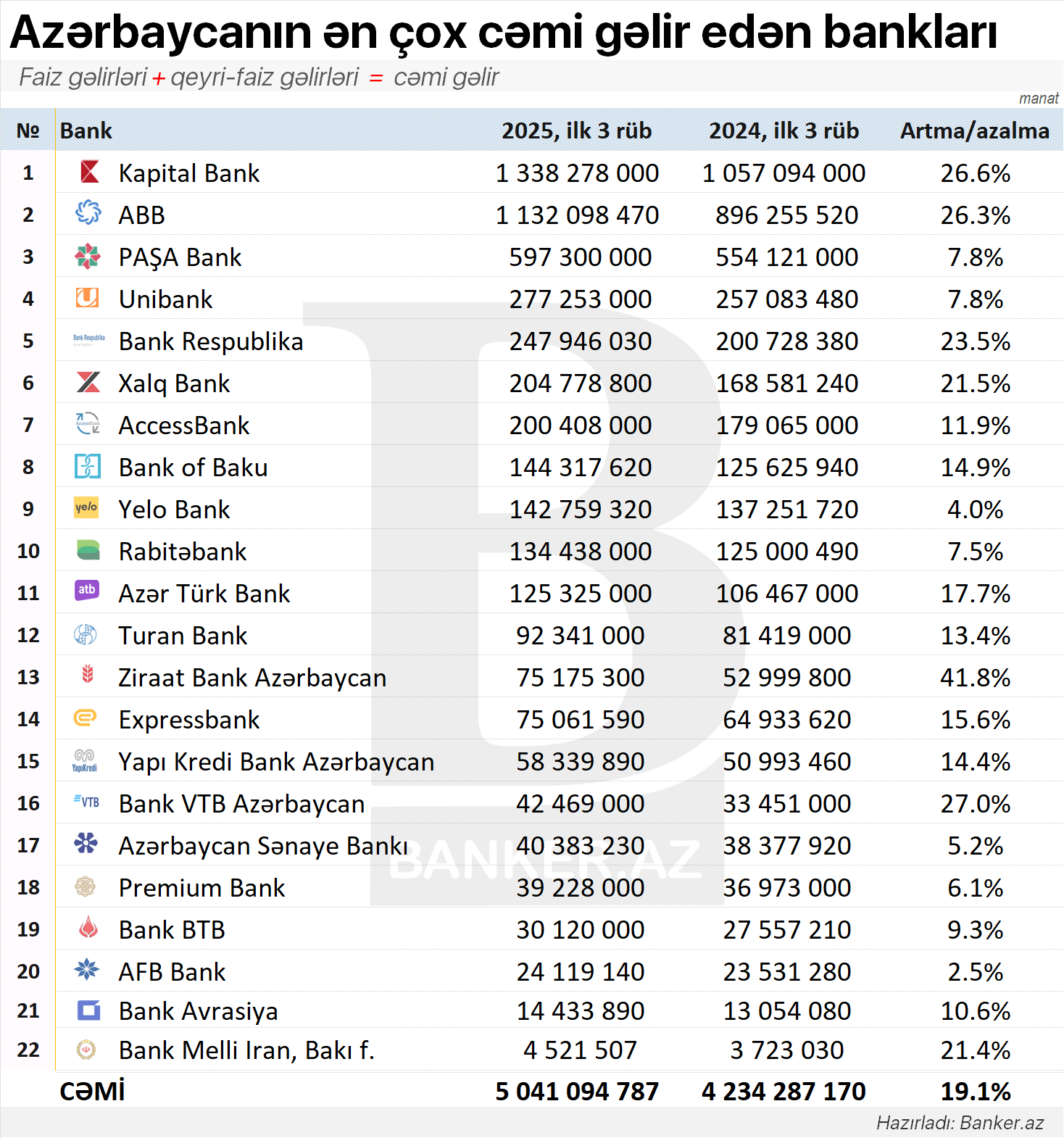 2025-ci ilin ilk üç rübü üzrə Azərbaycan bank sektorunun cəmi gəlirləri (faiz və qeyri-faiz gəlirləri birlikdə) 5.04 mlrd. manat təşkil edib ki, bu da ötən ilin eyni dövrü ilə müqayisədə 19.1% artım deməkdir.