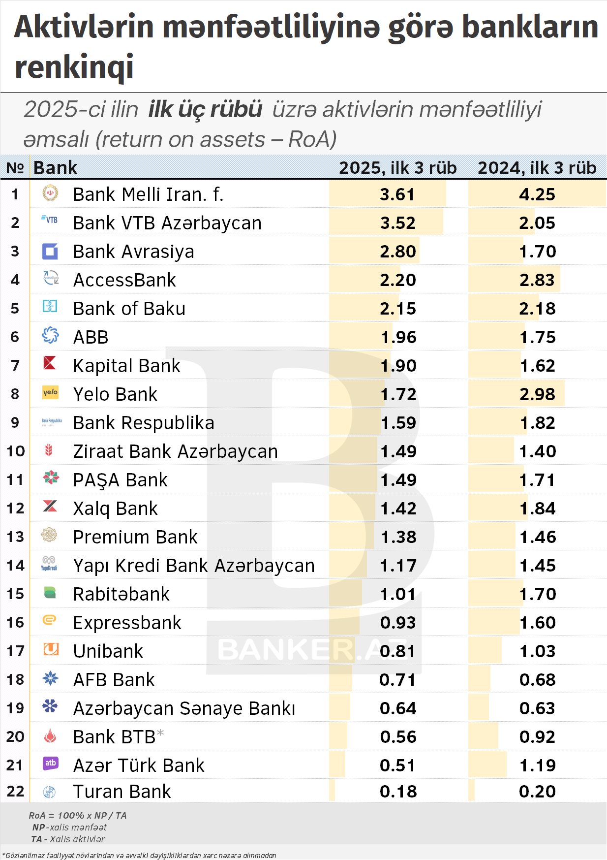 ROA (Return on Assets) — bankın aktivlərindən nə qədər gəlir əldə etdiyini göstərən göstəricidir. Sadə desək, bankın hər 100 manatlıq aktivinə qarşı nə qədər xalis mənfəət qazandığını ölçür.