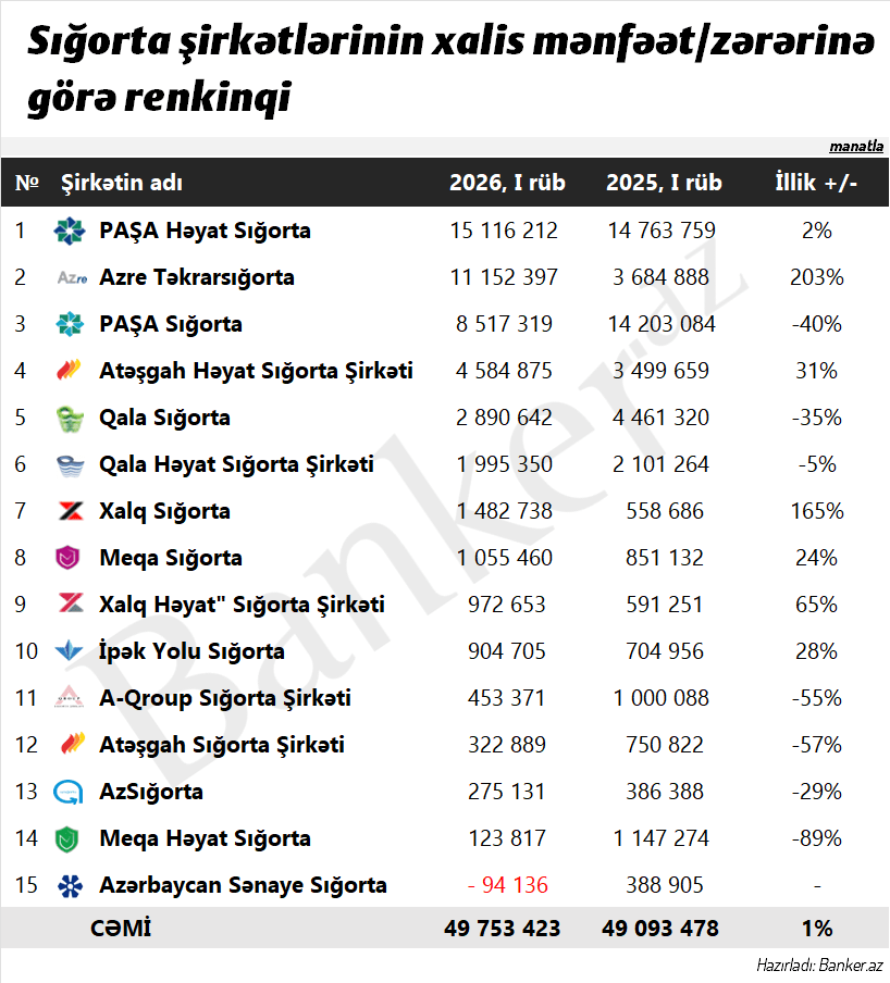 2026-cı ilin I rübündə sığorta şirktətlərinin xalis mənfəətinə görə RENKİNQİ