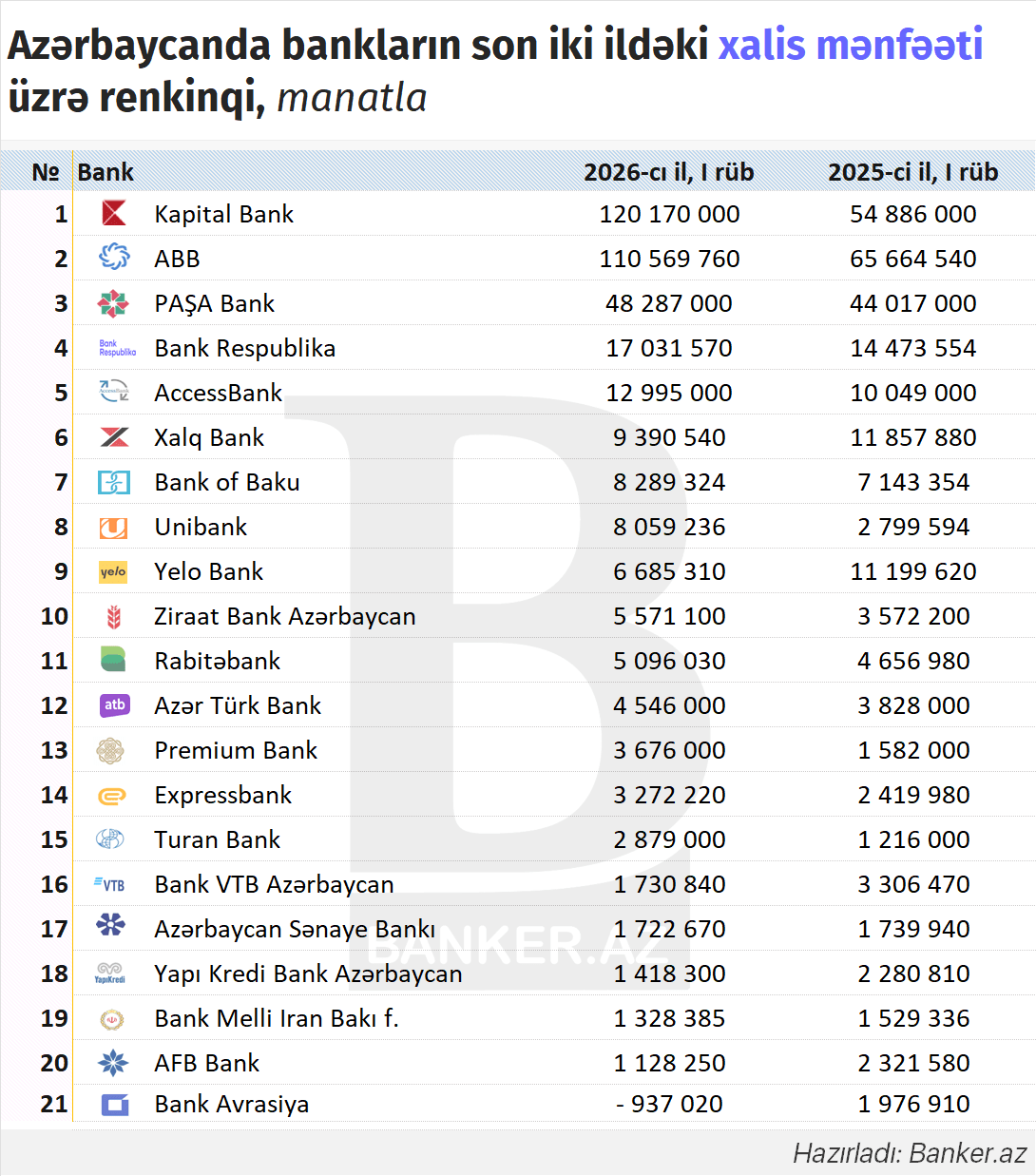 Azərbaycanda 2026-cı ilin I rübündə bank sektorunda 21 bankdan* 20-i xalis mənfəət əldə edib.