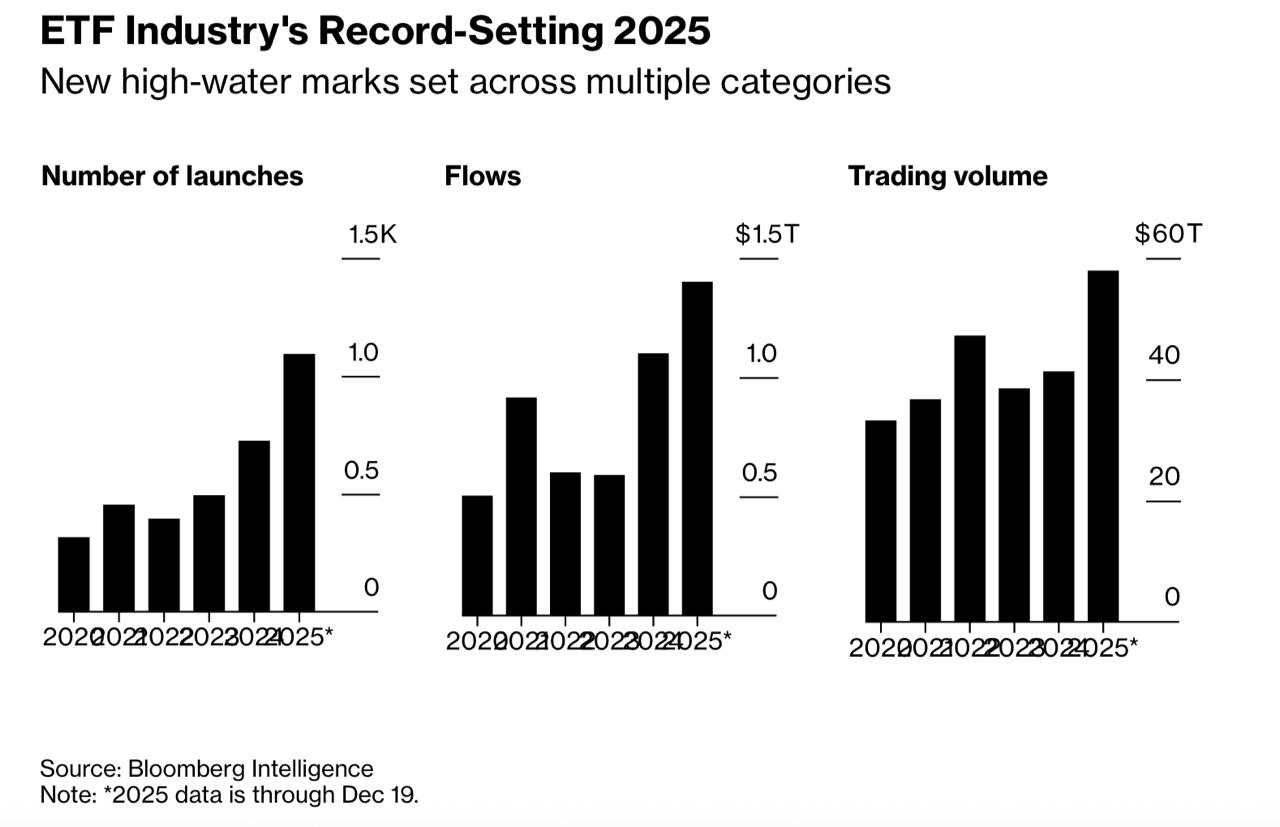 Geridə qalan il ABŞ-da birja ticarət fondları (ETF) sənayesi üçün həcmi təxminən 13 trilyon dollar olan rekord il olacaq və bu, eyni anda bir neçə göstərici üzrə özünü göstərəcək. Bloomberg Intelligence-in məlumatına görə, ilin əvvəlindən ABŞ-da ticarət olunan ETF-lər təxminən 1,4 trilyon dollar vəsait cəlb edib — bu, indiyədək qeydə alınmış ən yüksək göstəricidir. Eyni zamanda yeni fondların buraxılışlarının sayı 1 000-i ötüb, ticarət dövriyyələri isə tarixi maksimumu yeniləyərək təxminən 80 trilyon dollara yaxınlaşıb (qrafikə bax).