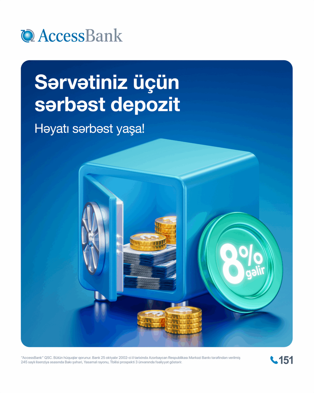 ®Müştərilərinin artıq etibarlı tərəfdaşına çevrilən AccessBank, maliyyə bazarında yenilik etməyə davam edir. Bank, çevik və unikal şərtlərlə təqdim olunan “Sərbəst Əmanət” məhsulunu istifadəyə verdi. Yeni depozit növü müştərilərə həm yüksək gəlir, həm də vəsaitlərin idarəolunmasında tam azadlıq imkanı yaradır.