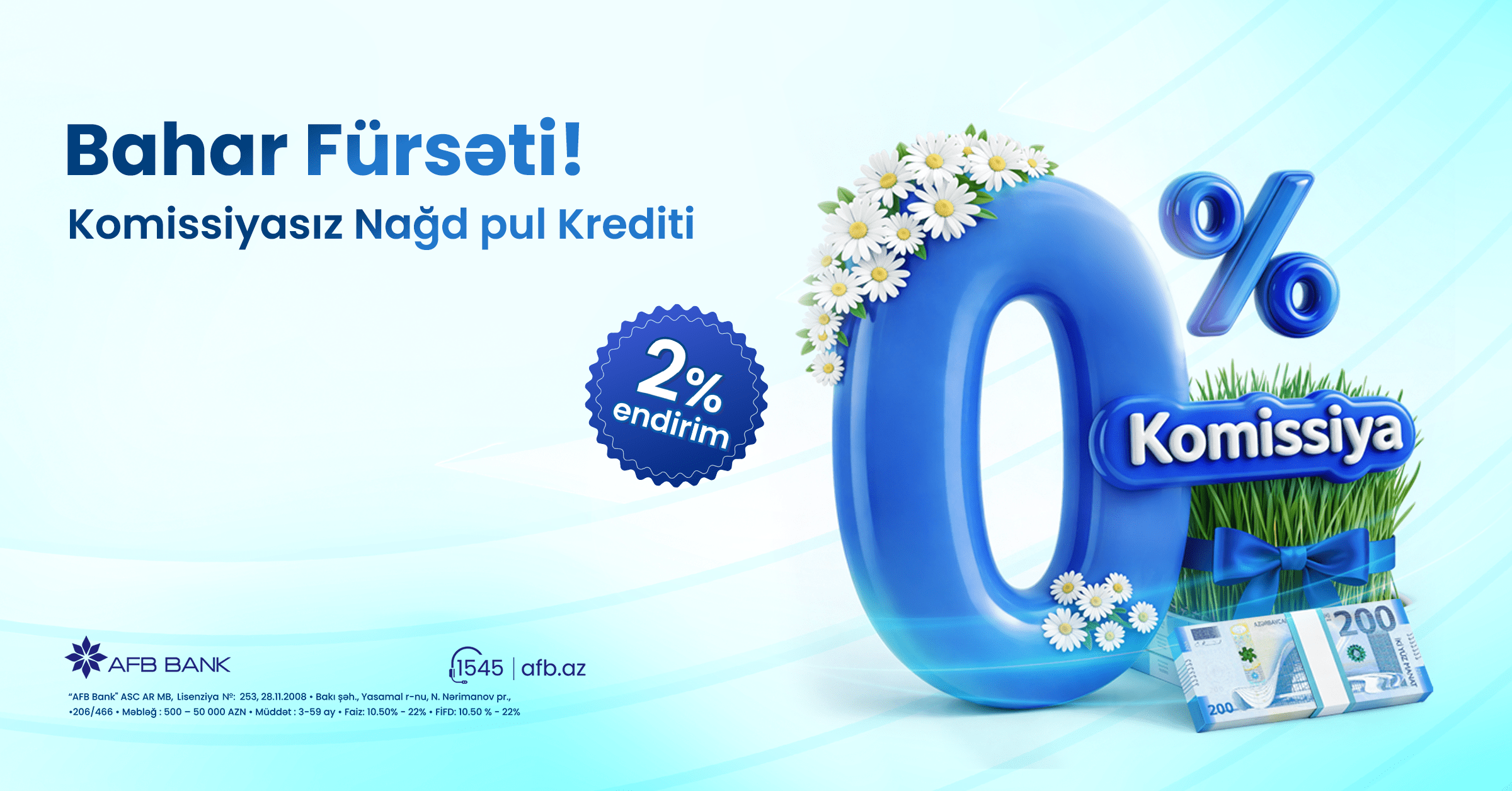 ®AFB Bank yaz mövsümünü müştəriləri üçün daha sərfəli kredit təklifi ilə qarşılayır. Bank “Bahar Fürsəti” adlı yeni nağd pul kredit kampaniyasına start verib. Kampaniya çərçivəsində müştərilər kreditləri 0% komissiya ilə – yəni əlavə rəsmiləşdirmə xərci ödəmədən əldə edə, eyni zamanda kredit faizlərindən 2% endirim qazana bilərlər.
