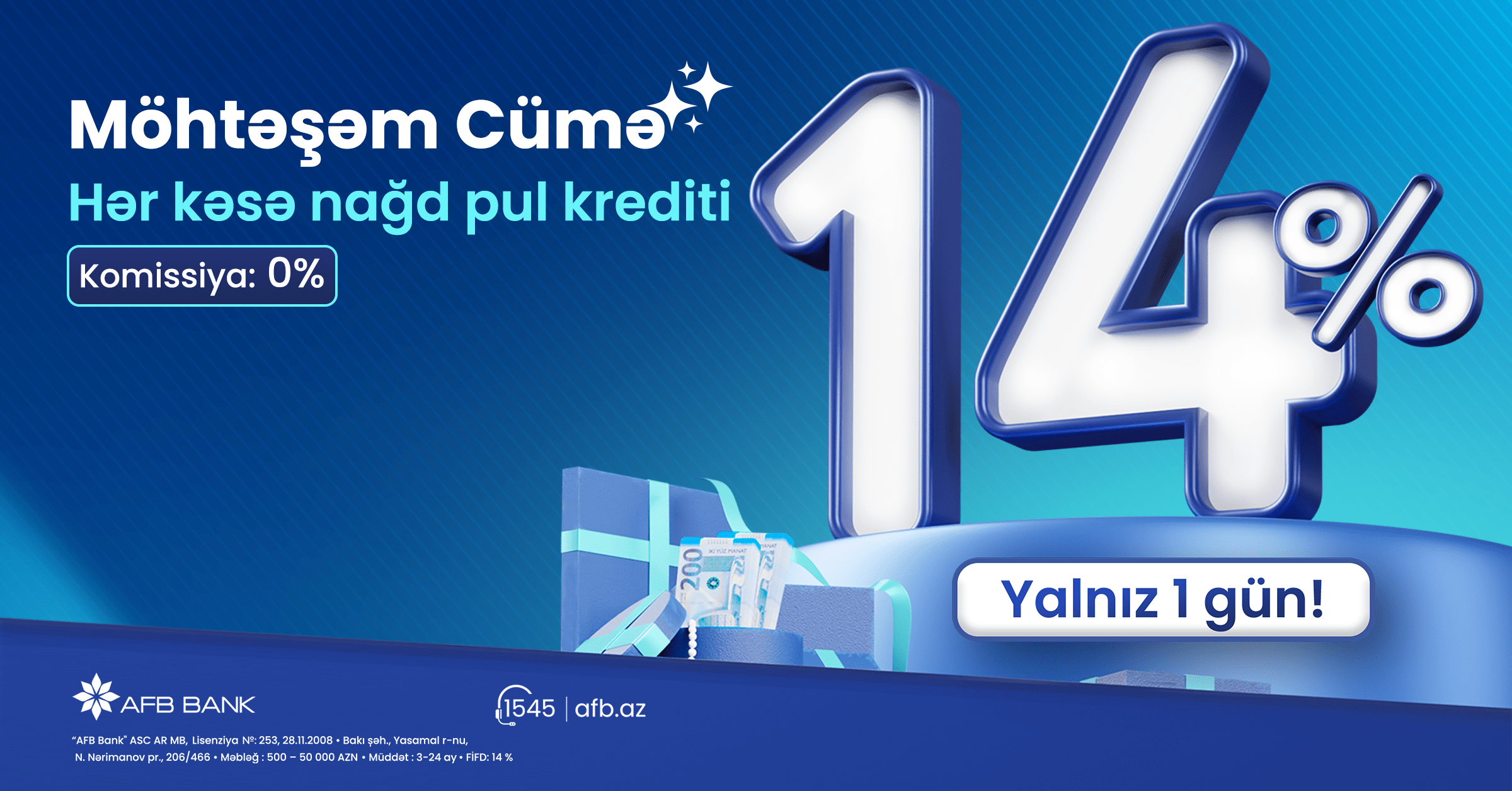 “Möhtəşəm Cümə” kampaniyası AFB Bank-ın müştərilərə daha əlçatan və sərfəli maliyyə həlləri təqdim etmək məqsədini daşıyır. Kampaniya yalnız 28.11.2025 tarixində qüvvədə olacaq.