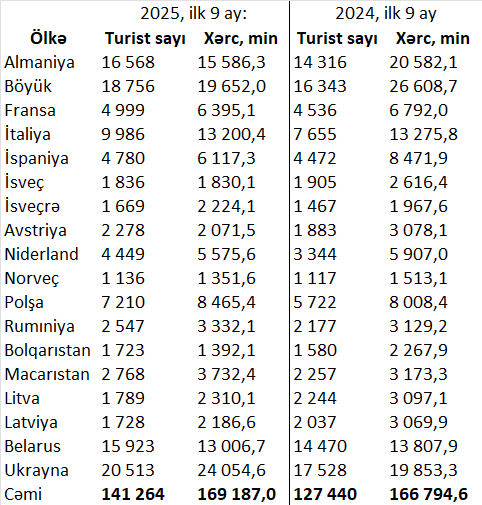 2025-ci ilin ilk 9 ayında Azərbaycana gələn Avropa ölkələri turistlərinin sayı 141 264 nəfər olub.