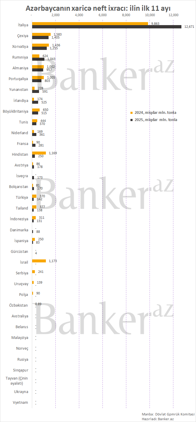 Banker.az Dövlət Gömrük Komitəsinin təqdim etdiyi hesabata istinadən xəbər verir ki, 2025-ci ilin yanvar–noyabr aylarında isə ümumi ixrac həcmi azalaraq təxminən 11.51 mln. ton səviyyəsində formalaşıb. İtaliyanın payı kəskin artaraq təxminən 12.67 mln. ton və 6.52 mlrd. ABŞ dollarına çatıb. Rumıniya, Yunanıstan, İrlandiya, Fransa, Niderland və digər Avropa ölkələrinə ixrac da yüksəlib. Nəticədə 2025-ci ildə Avropanın ümumi ixracdakı payı təxminən 80%-ə yaxınlaşıb.