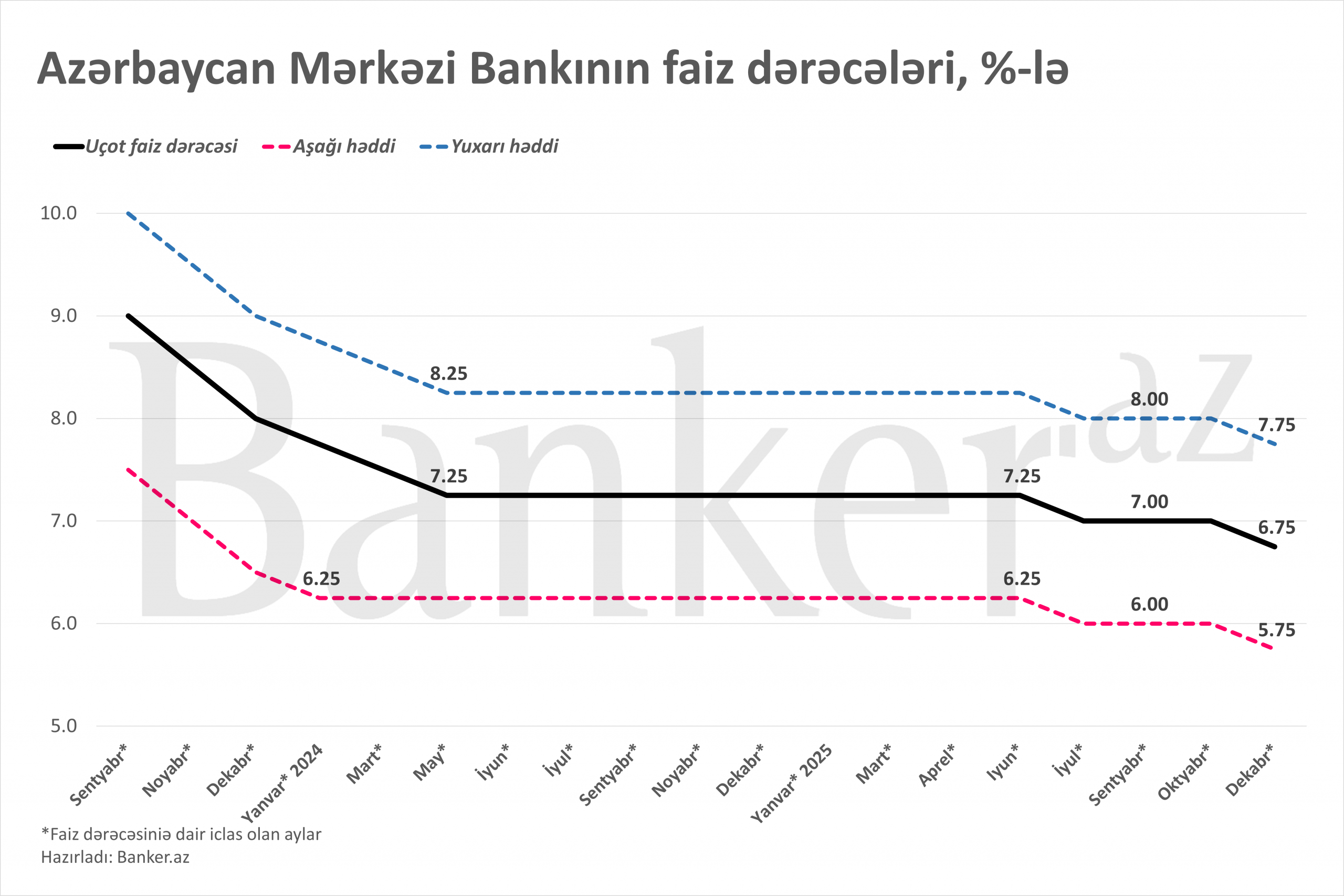 Azərbaycan Respublikası Mərkəzi Bankının İdarə Heyətinin qərarı ilə faiz dəhlizinin bütün parametrləri 0.25 faiz bəndi azaldılıb. Uçot dərəcəsi 6.75%, faiz dəhlizinin aşağı həddi 5.75%, faiz dəhlizinin yuxarı həddi isə 7.75% səviyyəsinə endirilib.