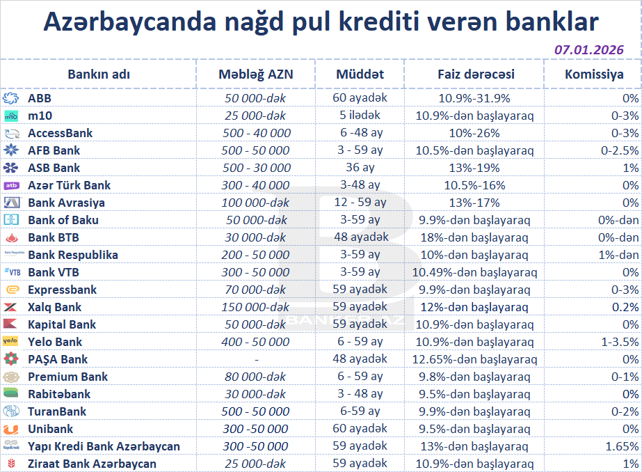 Hansı bankın daha sərfəli şərtlərlə nağd pul krediti təklif etdiyini isə cədvəldən tanış ola bilərsiniz.