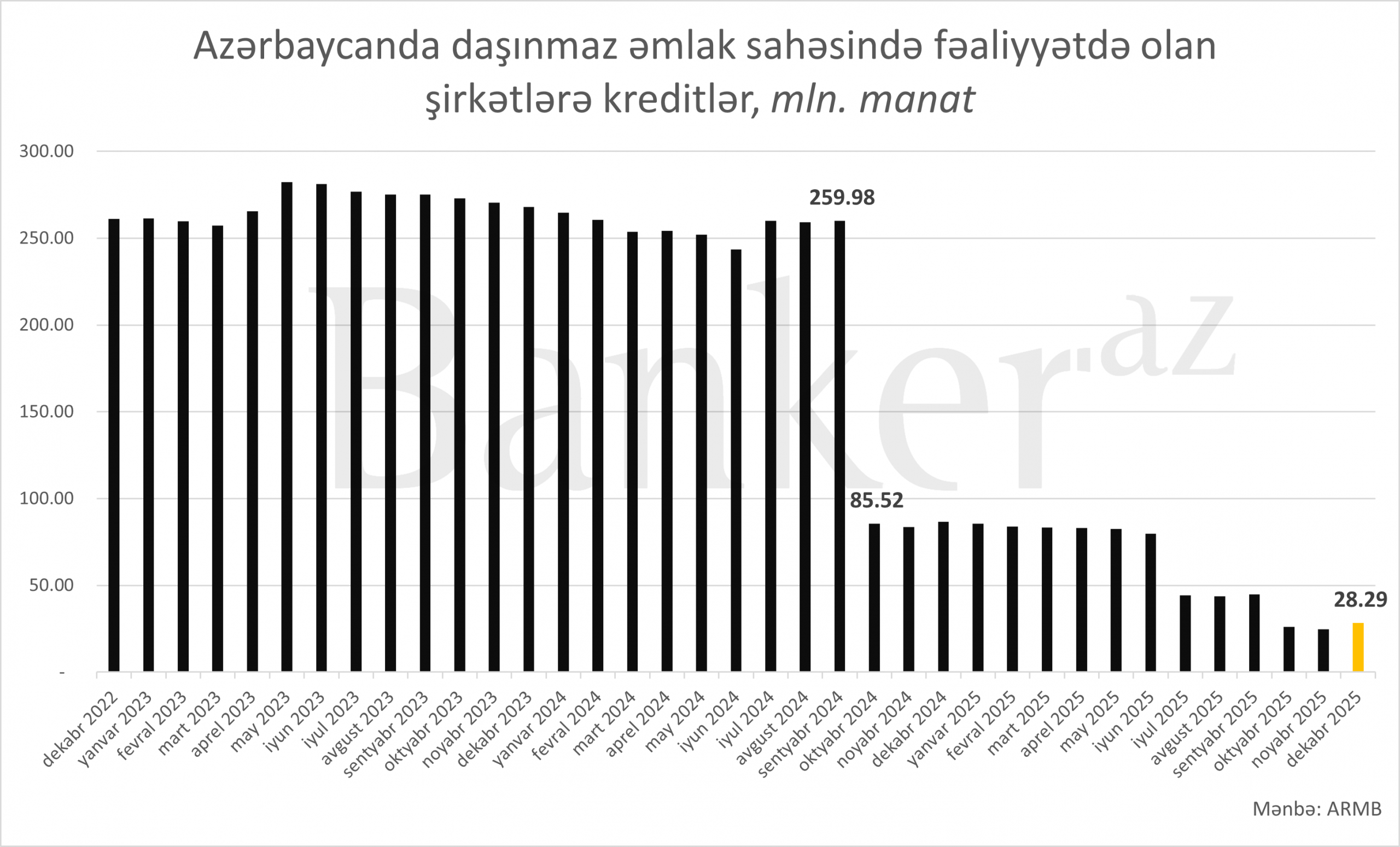 Azərbaycanda daşınmaz əmlak sektorunda fəaliyyət göstərən şirkətlərə verilən verilən kreditlərin həcmi son illərdə kəskin azalmasıdır və son 6 ilin minimum səviyyəsinə düşüb.