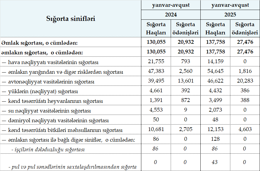2025-ci ilin ilk səkkiz ayında Azərbayanda könüllü əmlak sığortası bazarı 8 faiz artdığı halda, ödənişlər 31 faiz artıb