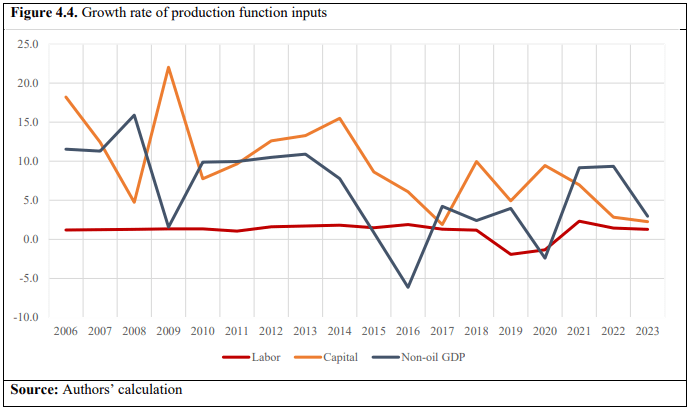 Müxtəlif qiymətləndirmə üsullarından istifadə etməklə qeyri-neft potensial məhsul artımı təxminən 5% səviyyəsində müəyyən olunmuşdur. Qısamüddətli ÜDM artımının bu səviyyədən yüksək olması iqtisadiyyatda hərarətlənmə əlaməti kimi qiymətləndirilə bilər, lakin müəssisə səviyyəsindəki məlumatlar bunun əksini göstərir.
