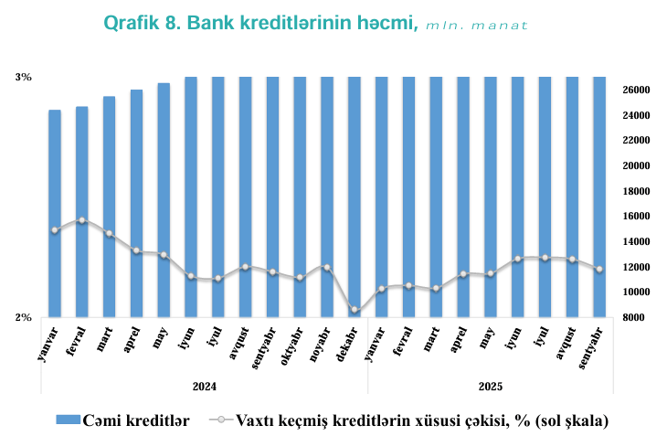 2025-ci il sentyabrın sonuna olan məlumata görə, bank sektorunun ümumi kredit portfeli 29 milyard 276,3 milyon manat, qeyri-bank kredit təşkilatlarının (QBKT) kredit portfeli isə 1 milyard 765,5 milyon manat olub.