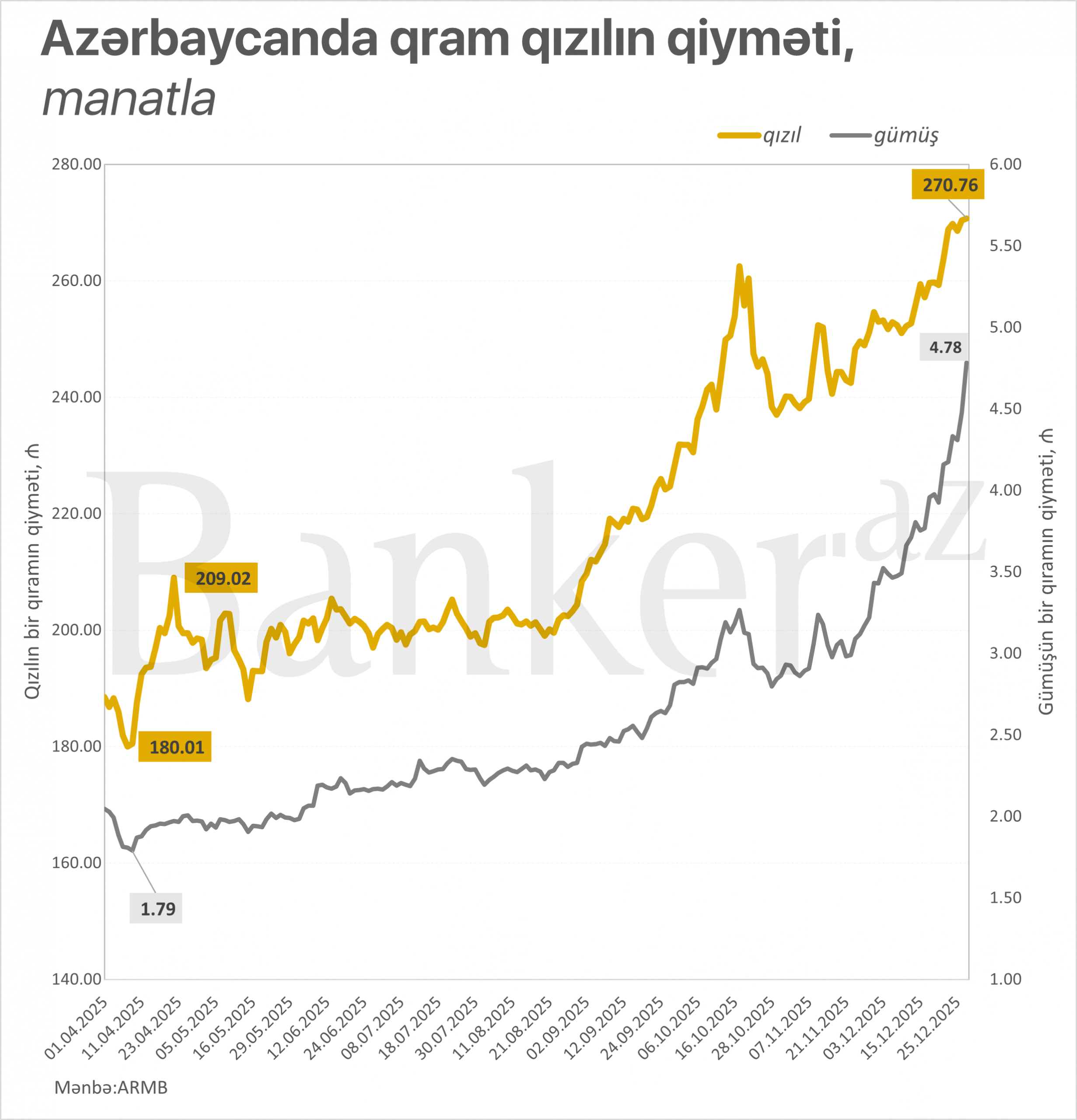 Bütün dünyada olduğu kimi geosiyasi gərnginliklərin aydan-aya daha da dərinləşməsi və əsas mərkəzi bankların faizlərlə bağlı endirim qərarları qiymətli metalları tarixi maksimum zirvələrə qaldırdı. Bu artım Azərbaycandan da yan keçməyib. Qiymətli metal bazarının iki əsas bençmarkı qızıl və gümüş manata qarşı kəskin dəyər qazanmaqda davam edirlər.