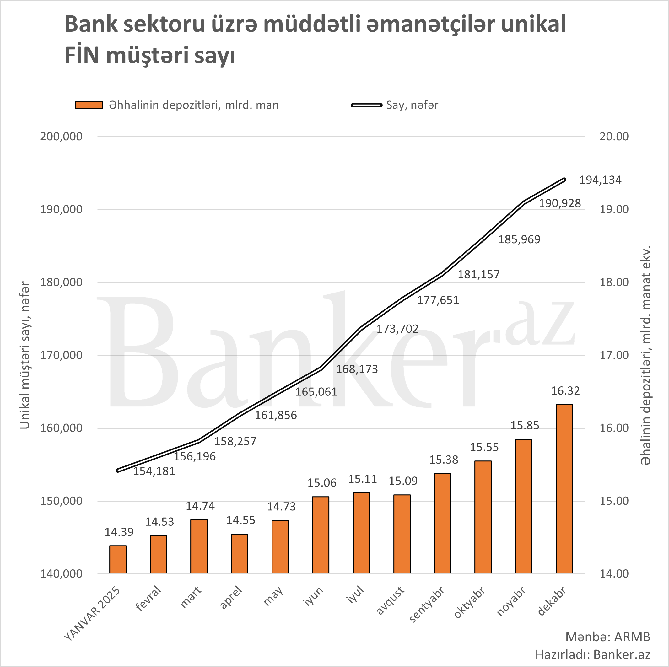 2025-ci ilin yanvarında əhalinin banklardakı depozitləri 14.39 mlrd. manat təşkil etdiyi halda, dekabr ayında bu göstərici 16.32 mlrd. manata yüksəlib. İllik müqayisədə depozit portfeli 1.93 mlrd. manat və ya təxminən 13.4 faiz artıb. Bunun 5.14 mlrd. manatı isə xarici valyutada olan depozitlər olub.