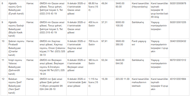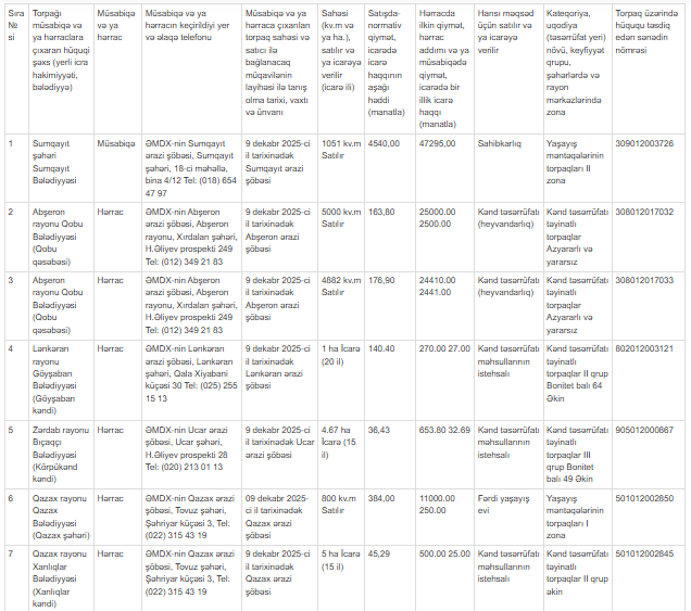 Torpaq müsabiqə və hərracları 10 dekabr 2025-ci il saat 15:00-da keçiriləcəkdir.