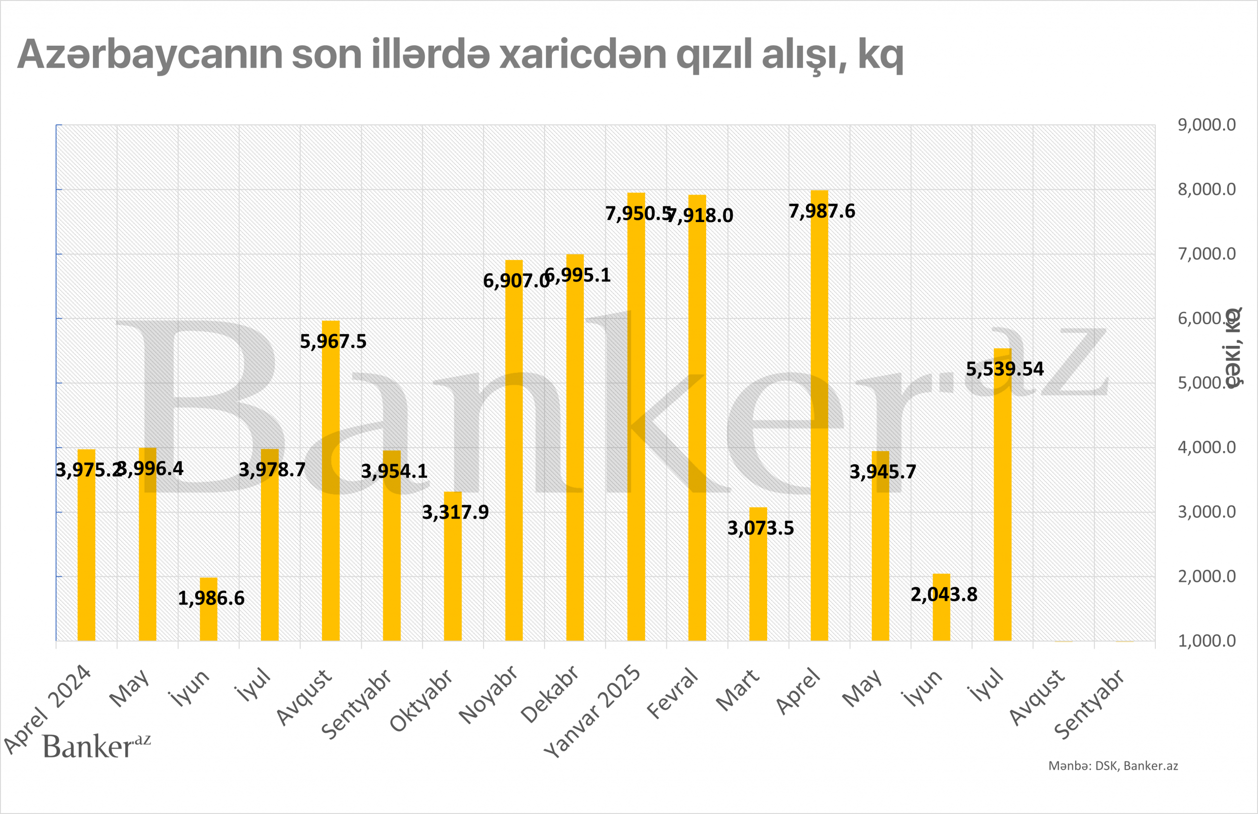Azərbaycan qeyri-monetar qızıl alışının həcmini 2025-ci ilin ilk üç rübündə 38 478 kiloqram və ya 3 milyard 750.3 milyon ABŞ dollarına çatdırsa da, aylıq idxal həcmi bir il yarımın ən aşağı həddinə düşüb.
