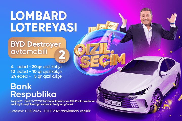 Bank Respublika-dan sərfəli şərtlərlə lombard krediti götürün, “Qızıl Seçim” lotereyasının iştirakçısına çevrilin və qiymətli hədiyyələrdən birinin sahibi olmaq şansını əldə edin! İlk tirajın oynanılmasına 1 ay qaldı.