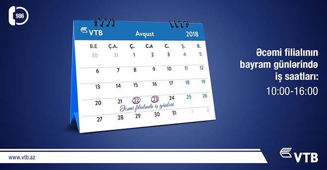 22 və 23 avqust 2018-ci il tarixində Qurban bayramı günləri Cavadxan küç. 30A (“Əcəmi” metrostansiya yaxınlığı) ünvanında yerləşən bank VTB (Azərbaycan)-ın “Əcəmi” filialı müştərilərə xidmət göstərməyə davam edəcək. Bankın ofisi saat 10.00-dan 16.00-dək çalışacaq.