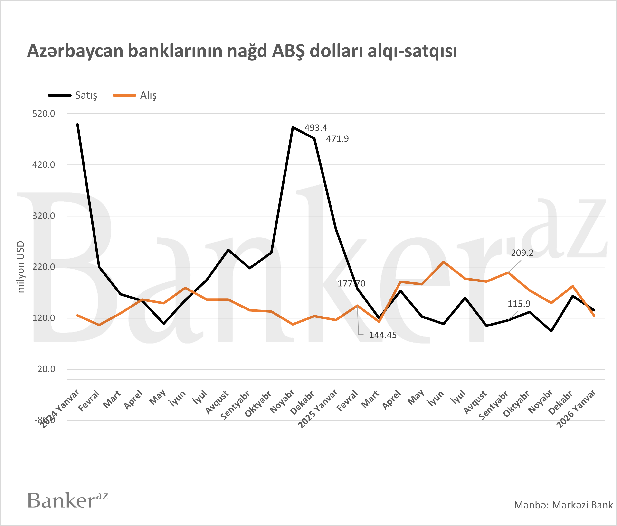 Banker.az Mərkəzi Banka istinadən xəbər verir ki, 2026-cı ilin yanvarında banklar əhaliyə nağd 135.6 milyon ABŞ dolları satdığı halda, onlardan cəmi 124.9 milyon dollar alıblar.