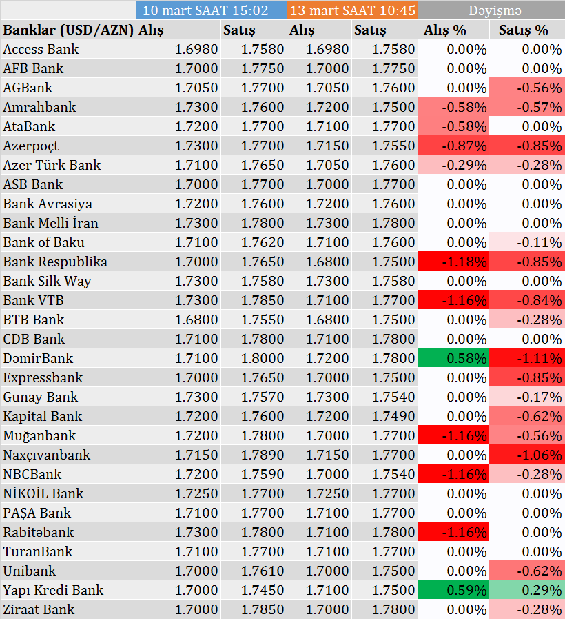 Banker.azın banklar arasında apardığı monitorinqin nəticəsində , bankların rəsmi məzənnələrini oxucularına təqdim edir. Məzənnələr həm dollar, həmdə avro üçün verilmişdir.