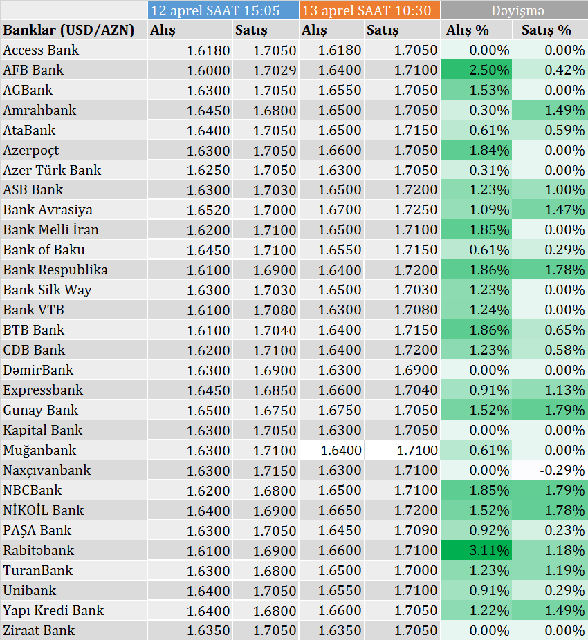 Bankların alış qiymətində də artım var. (…dəyişikliklərlə bağlı ətraflı linkdə)