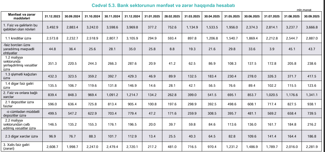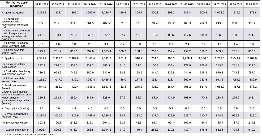 2025-ci ilin yanvar-sentyabr ayları ərzində Azərbaycanda fəaliyyət göstərən banklar ümumilikdə 910,7 milyon manat xalis mənfəət əldə ediblər.