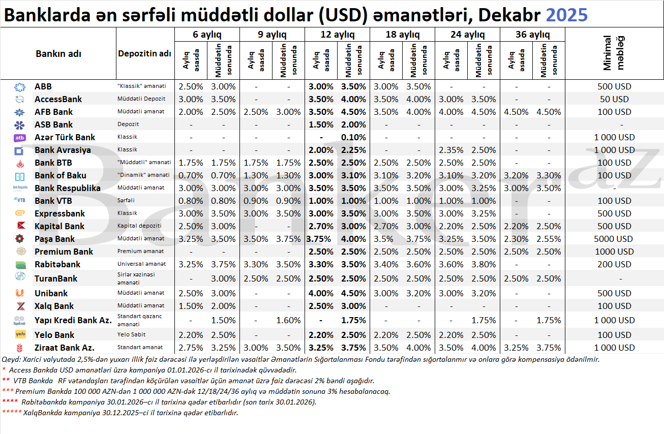 Banker.az 05 dekabr 2025-ci il tarixinə Azərbaycanda ABŞ dolları əmanəti faizlərinə görə 6 aydan 36 ayadək müddəti əhatə edən bankları təqdim edir: