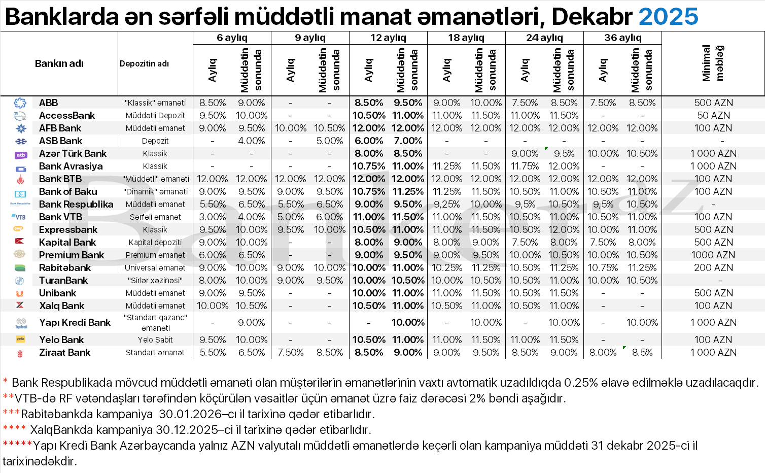 Banker.az 05 dekabr 2025-ci il tarixinə Azərbaycanda manat əmanət faizlərinə görə 6 aydan 36 ayadək müddəti əhatə edən bankları təqdim edir: