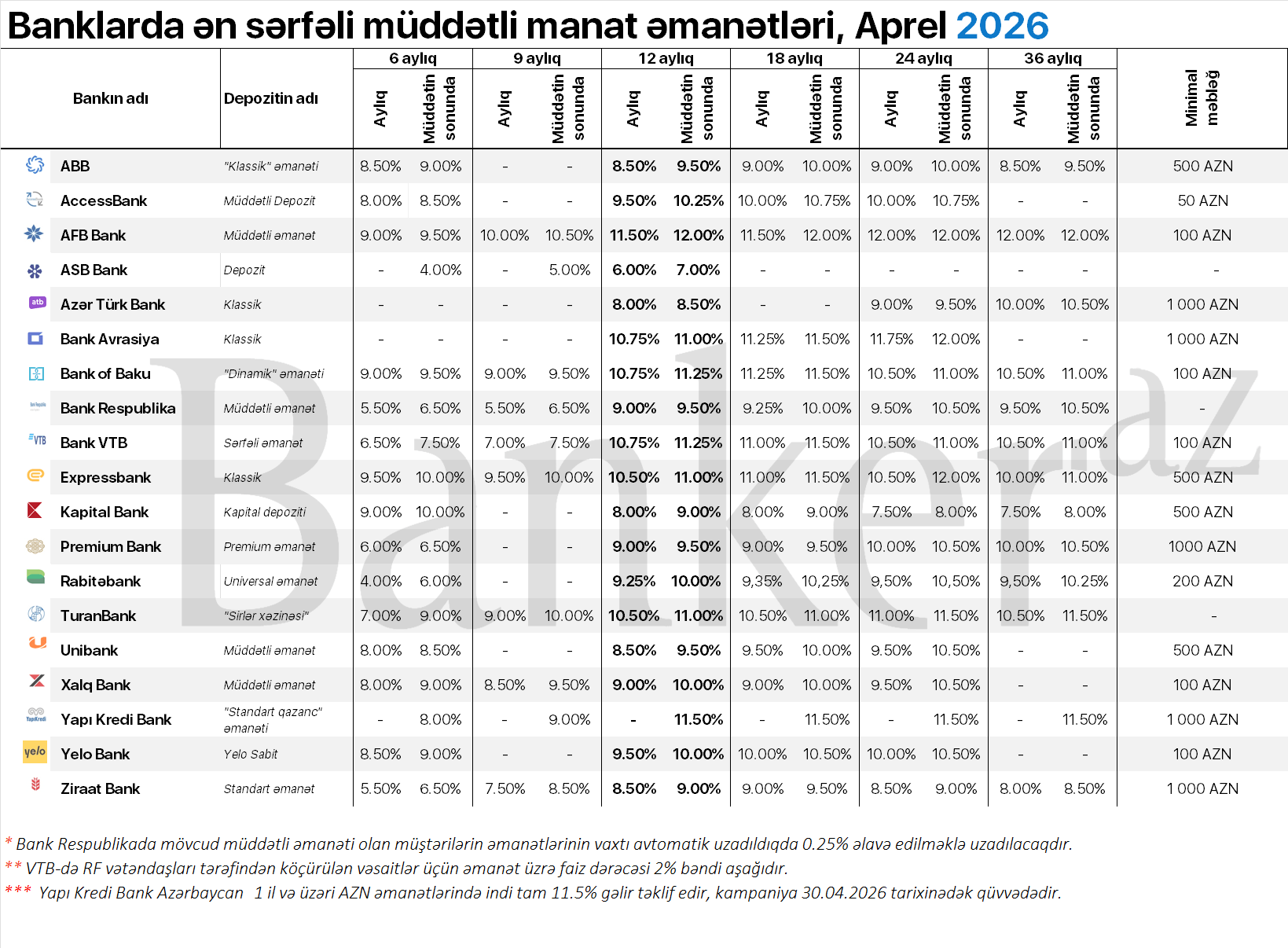 Banker.az 2026-cı ilin aprelinə Azərbaycanda manat üzrə 6 aydan 36 ayadək müddəti əhatə edən əmanət faizlərini təqdim edir: