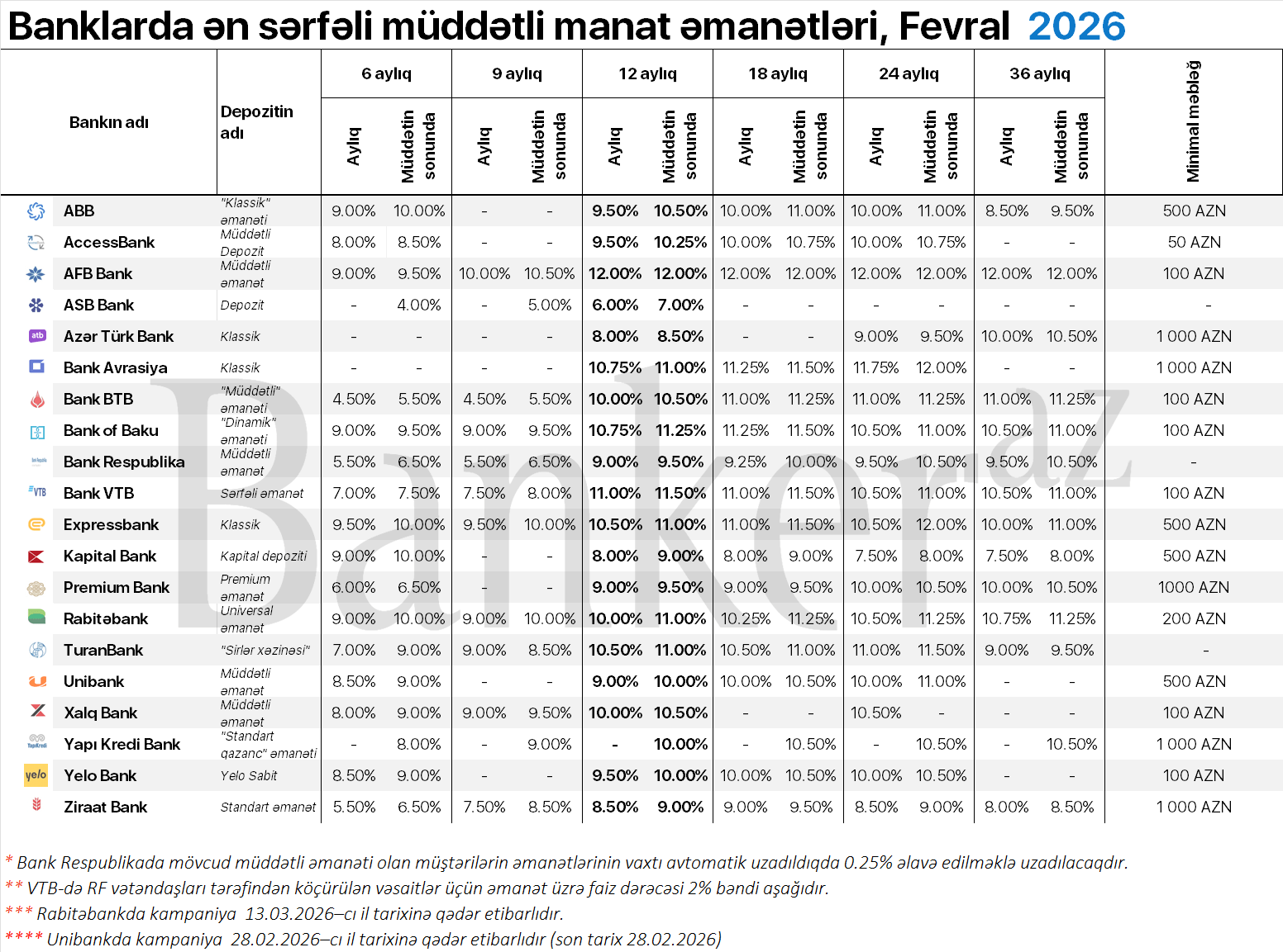 Banker.az 5 fevral 2026-cı il tarixinə Azərbaycanda manat üzrə 6 aydan 36 ayadək müddəti əhatə edən əmanət faizlərini təqdim edir: