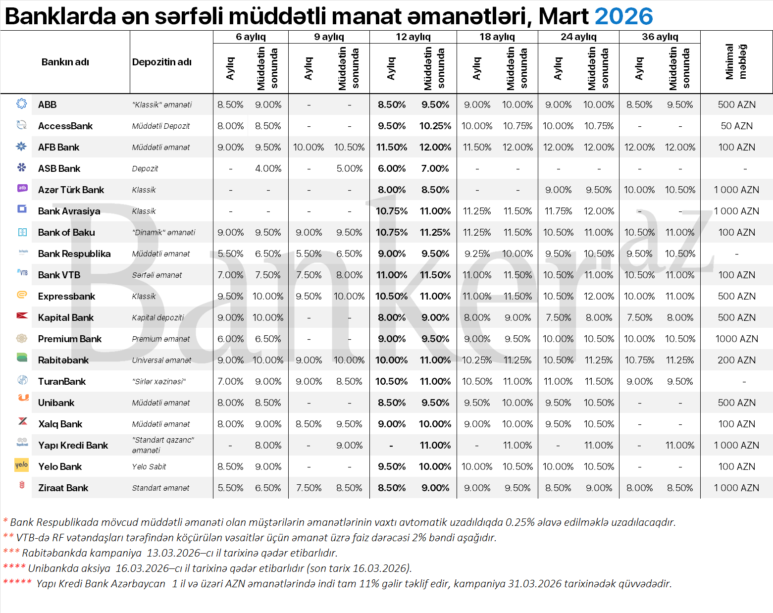 Banker.az 6 mart 2026-cı il tarixinə Azərbaycanda manat üzrə 6 aydan 36 ayadək müddəti əhatə edən əmanət faizlərini təqdim edir: