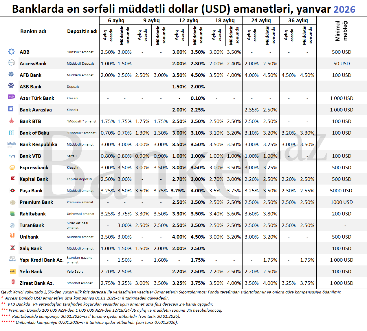 Banker.az 6 yanvar 2026-ci il tarixinə Azərbaycanda ABŞ dolları (USD) üzrə 6 aydan 36 ayadək müddəti əhatə edən əmanət faizlərini təqdim edir: