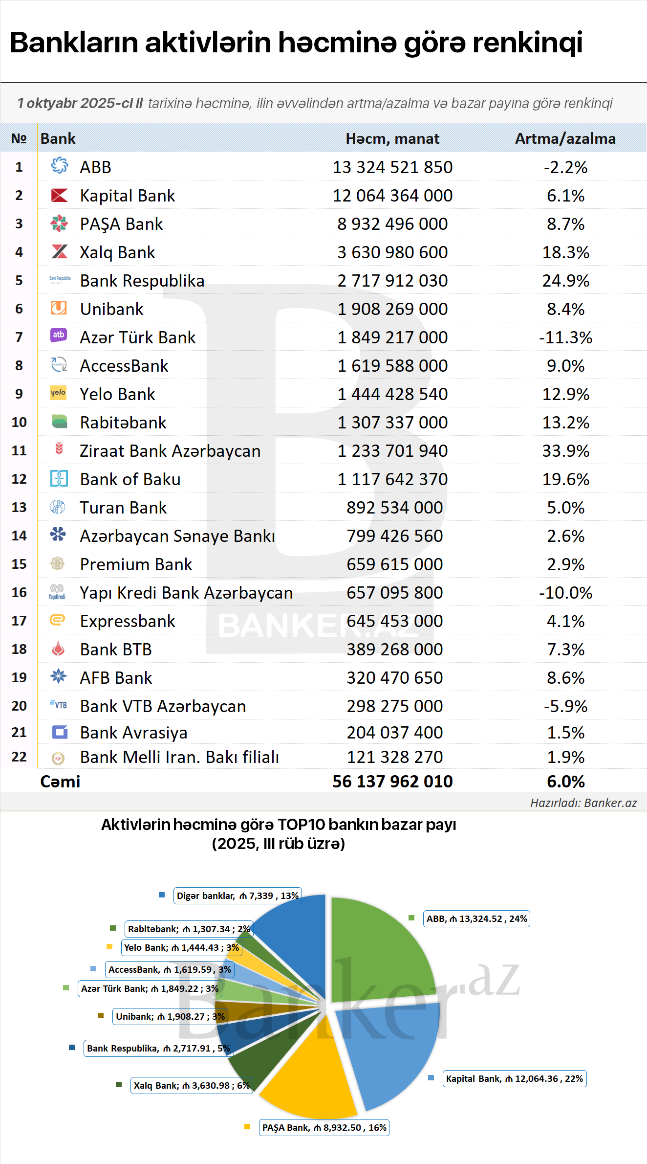 Banker.az bankların rüblük hesabatlarını hesabalayaraq bu nəticəyə gəlir. Aktivlərin  87 faizi TOP10 bankın payına düşür.