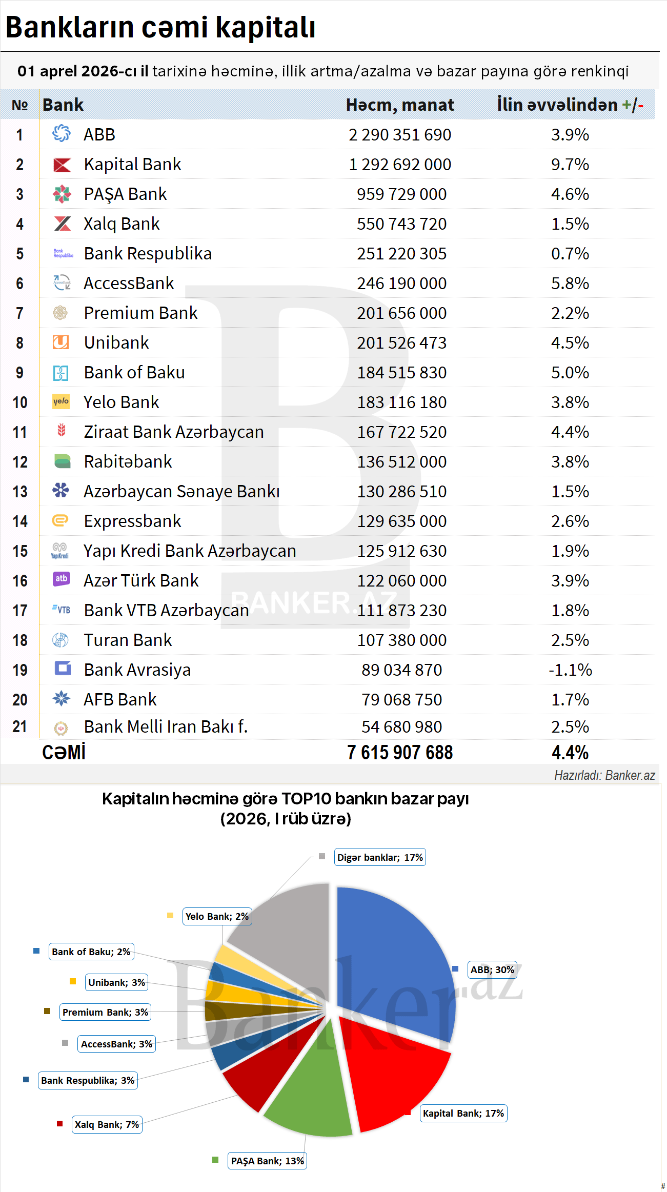 Azərbaycan bank sektorunda cəmi kapital 2026-cı ilin ilk rübündə 323.9 milyon manat və ya 4.4% illik artım nümayiş etdirib. Banker.az-ın bank hesabatlarına istinadən ilkin hesablamalarına görə, bankların ümumi kapitalı 7 milyard 615.5 milyon manata çatıb. Bu, 2025-ci ilin dördüncü rübündə 7 milyard 291.6 milyon manat idi.