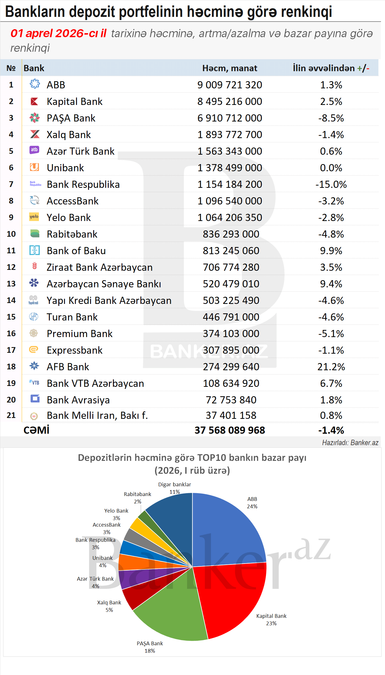 ABB 9.01 milyard manatlıq depozit portfeli ilə bazarda lider mövqeyini qoruyub və ilin əvvəlindən 1.3% artım qeydə alıb. İkinci yerdə 8.50 milyard manatla Kapital Bank qərarlaşıb və burada 2.5% artım müşahidə olunur.