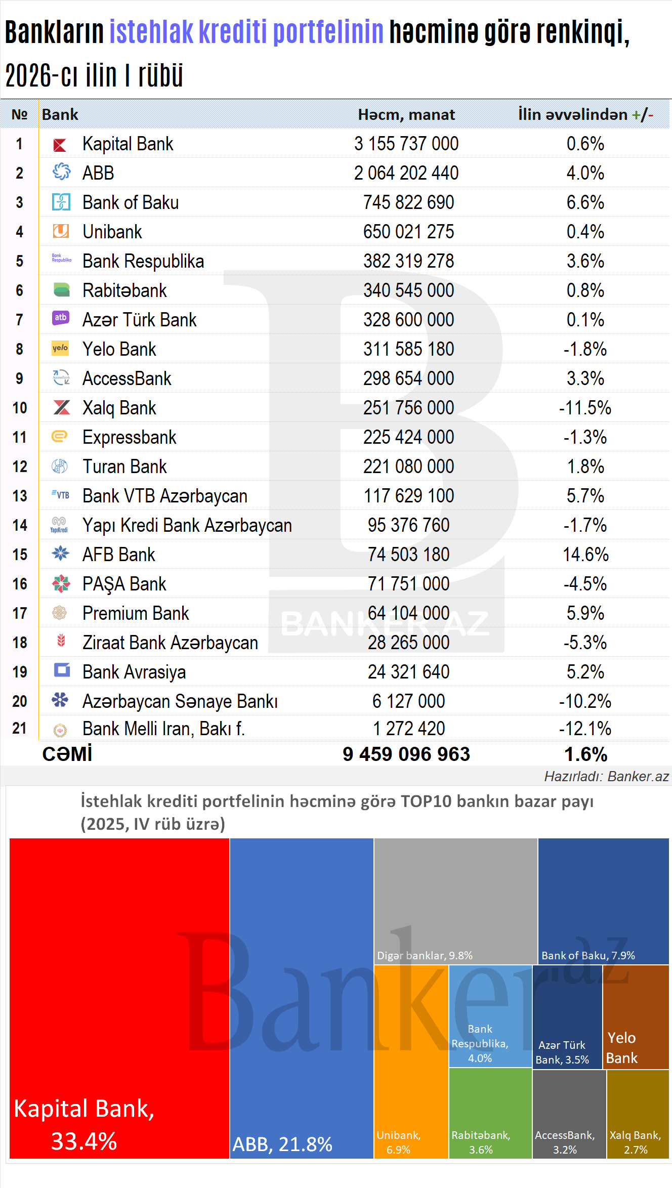 Kapital Bank 3.14 milyard manatlıq istehlak kredit portfeli ilə bazara liderlik edir və ilin əvvəlindən 0.6% artım qeydə alıb. İkinci yerdə 1.98 milyard manatla ABB qərarlaşıb və burada artım 4.0% təşkil edib. Üçüncü pillədə isə 699.93 milyon manatla Bank of Baku yer alıb və 6.6% artım nümayiş etdirib.