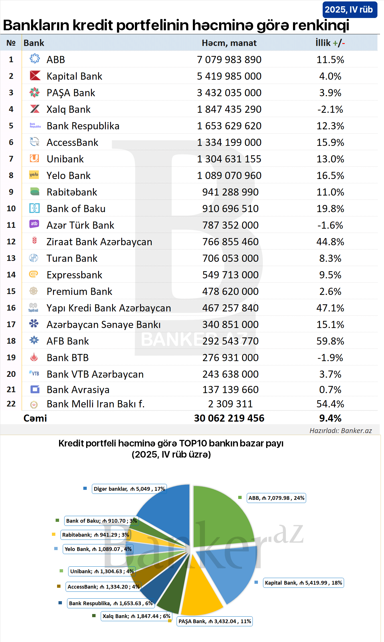 Kredit portfelinin həcminə görə ilk beş bankın əksəriyyətində artım müşahidə olunur. Xüsusilə ABB (11.5%) və Bank Respublika (12.3%) yüksək illik artım tempinə malikdir. Kapital Bank (4.0%) və PAŞA Bank (3.9%) daha mülayim artım nümayiş etdirib.