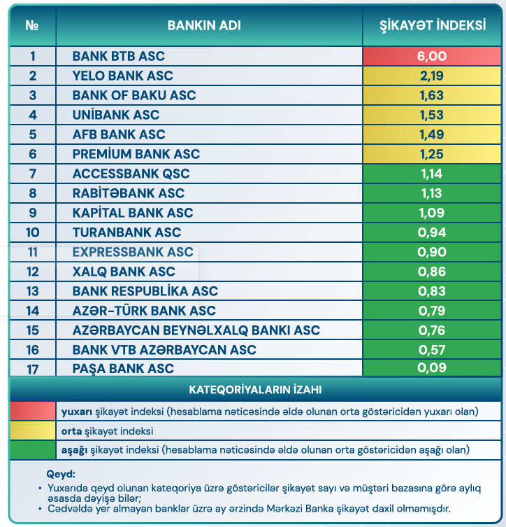 Bankların şikayət indeksi açıqlanıb Bank xəbərləri 15/01/2026 Paylaş FacebookTwitterWhatsAppTelegram Azərbaycan Mərkəzi Bankı kommersiya bank müştərilərinin xidmətlərindən istifadəsi üzrə şikayət indeksni açıqlayıb. Taglarşikayət indeksi Son xəbərlər Ümumi iqtisadi xəbərlər DSMF-nin sədri: “Orta aylıq pensiya 543 manata yüksəlib” 15/01/2026 Daşınmaz əmlak Bu şəxslər daşınmaz əmlakın qeydiyyatına dair dövlət rüsumundan azad edilir 15/01/2026 Bank xəbərləri AccessBank 2025-ci ilin sonuna olan maliyyə nəticələrini açıqlayır 15/01/2026 Elman Sadıqov Pəhləvi ideal variant deyil 15/01/2026 Digər xəbərlər Ümumi iqtisadi xəbərlər DSMF-nin sədri: “Orta aylıq pensiya 543 manata yüksəlib” 15/01/2026 Daşınmaz əmlak Bu şəxslər daşınmaz əmlakın qeydiyyatına dair dövlət rüsumundan azad edilir 15/01/2026 Bank xəbərləri AccessBank 2025-ci ilin sonuna olan maliyyə nəticələrini açıqlayır 15/01/2026 Elman Sadıqov Pəhləvi ideal variant deyil 15/01/2026