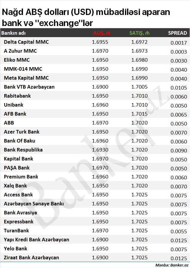 Dolların ən aşağı satış qiyməti 1.6972 AZN ilə “Delta Capital” MMC tərəfindən təklif olunur. Ona çox yaxın səviyyədə – 1.6973 AZN ilə “A Zuhur” MMC də əlverişli variant kimi çıxış edir. Bu valyuta dəyişmə məntəqəsi ən aşağı marja (spred) ilə dolları dəyişir.
