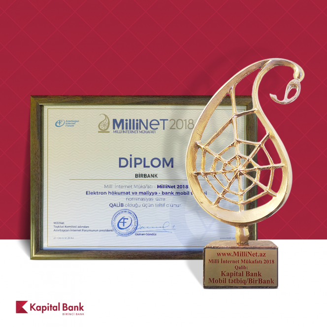 Kapital Bank-ın BirBank mobil tətbiqi Azərbaycan İnternet forumunun təsis etdiyi “Millinet” mükafatına layiq görülüb. BirBank ölkənin “Elektron hökumət və maliyyə-bank mobil tətbiqi” nominasiyasında ən yaxşı mobil tətbiq seçilib.
