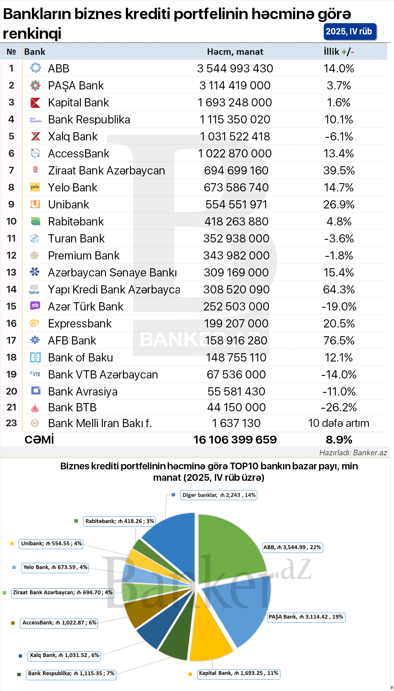 2025-ci ildə Azərbaycan bank sektorunda biznes kreditləri portfeli artımını davam etdirib. Banker.az xəbər verir ki, Bankların biznes krediti portfelinin ümumi həcmi ilin yekununda 16 milyard 106.4 milyon manata çatıb ki, bu da illik müqayisədə 8.9 faiz artım deməkdir.