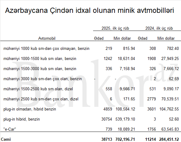 2025-ci ilin ilk üç rübündə Azərbaycan Çindən avtomobil idxalını kəskin artırıb. 2024-cü ilin analoji dövründə 11 214 ədəd olan idxal 2025-ci ildə 38 713 ədədə yüksəlib.