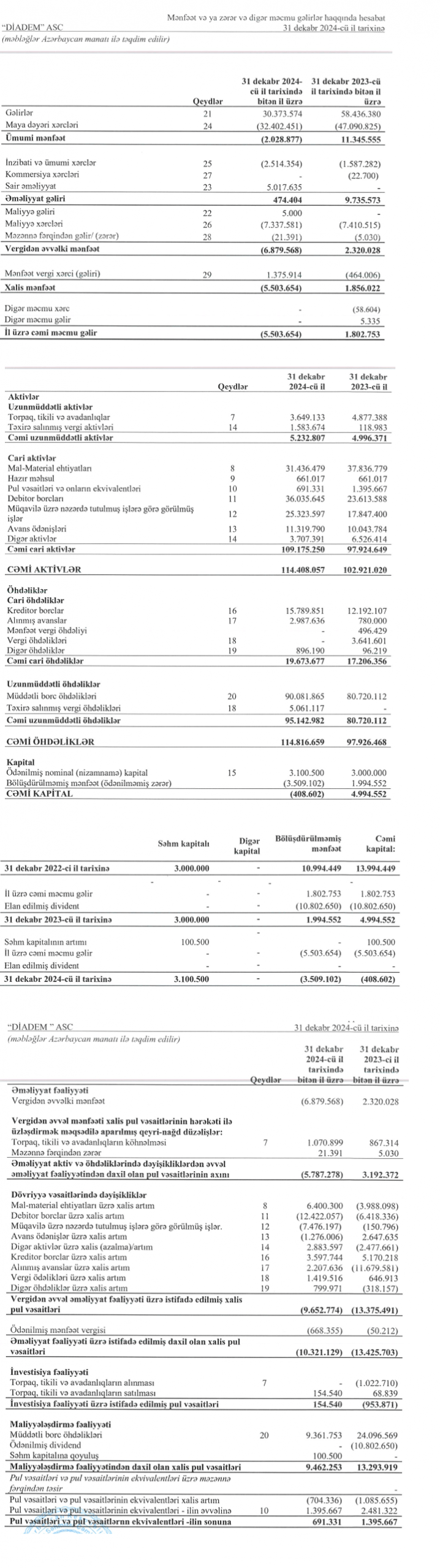 “Diadem” ASC-nin cəmi aktivlər 102,9 milyon manatdan 114,4 milyon manata artıb (+11%), öhdəlikləri isə 97,9 milyon manatdan 114,8 milyon manata qalxıb (+17%). Öhdəliklər aktivlərdən daha yüksək dinamika ilə artıb. Beləliklə, səhm sahiblərinin kapitalı 5 milyon manat zərər səbəbindən əriyərək 0,4 milyonlıq deifistə çevrilib.