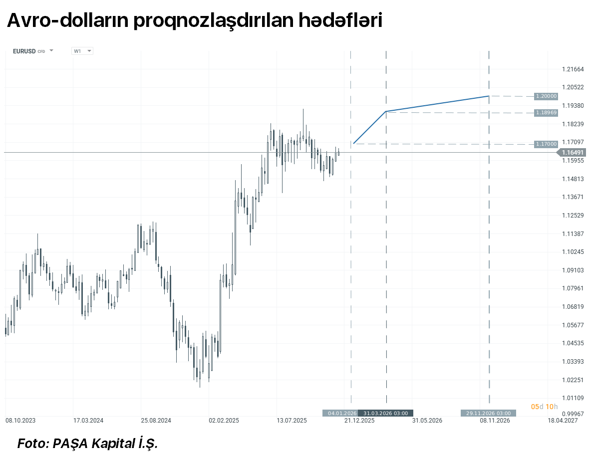 Sorğunun median proqnozlarına görə, avro-dollar məzənnəsi üç ay ərzində təxminən $1,17, altı ayda $1,19, bir il ərzində isə $1,20 səviyyəsində olacaq.