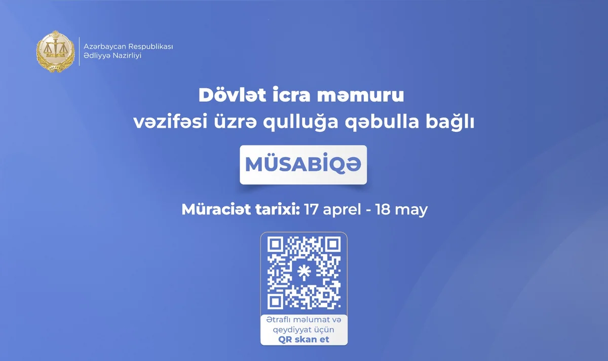 Ədliyyə Nazirliyinin Müsabiqə Komissiyası dövlət icra məmuru vəzifəsi üzrə qulluğa qəbulla bağlı müsabiqə elan edir.