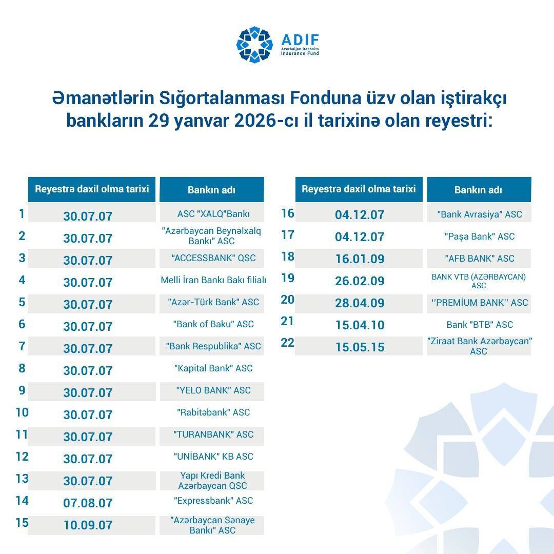 ®Əmanətlərin Sığortalanması Fondu “Əmanətlərin sığortalanması haqqında” Azərbaycan Respublikası Qanununun 30.1-ci maddəsinə əsasən iştirakçı bankların 28 yanvar 2026-cı il tarixinə olan reyestrini ictimaiyyətin diqqətinə çatdırır: