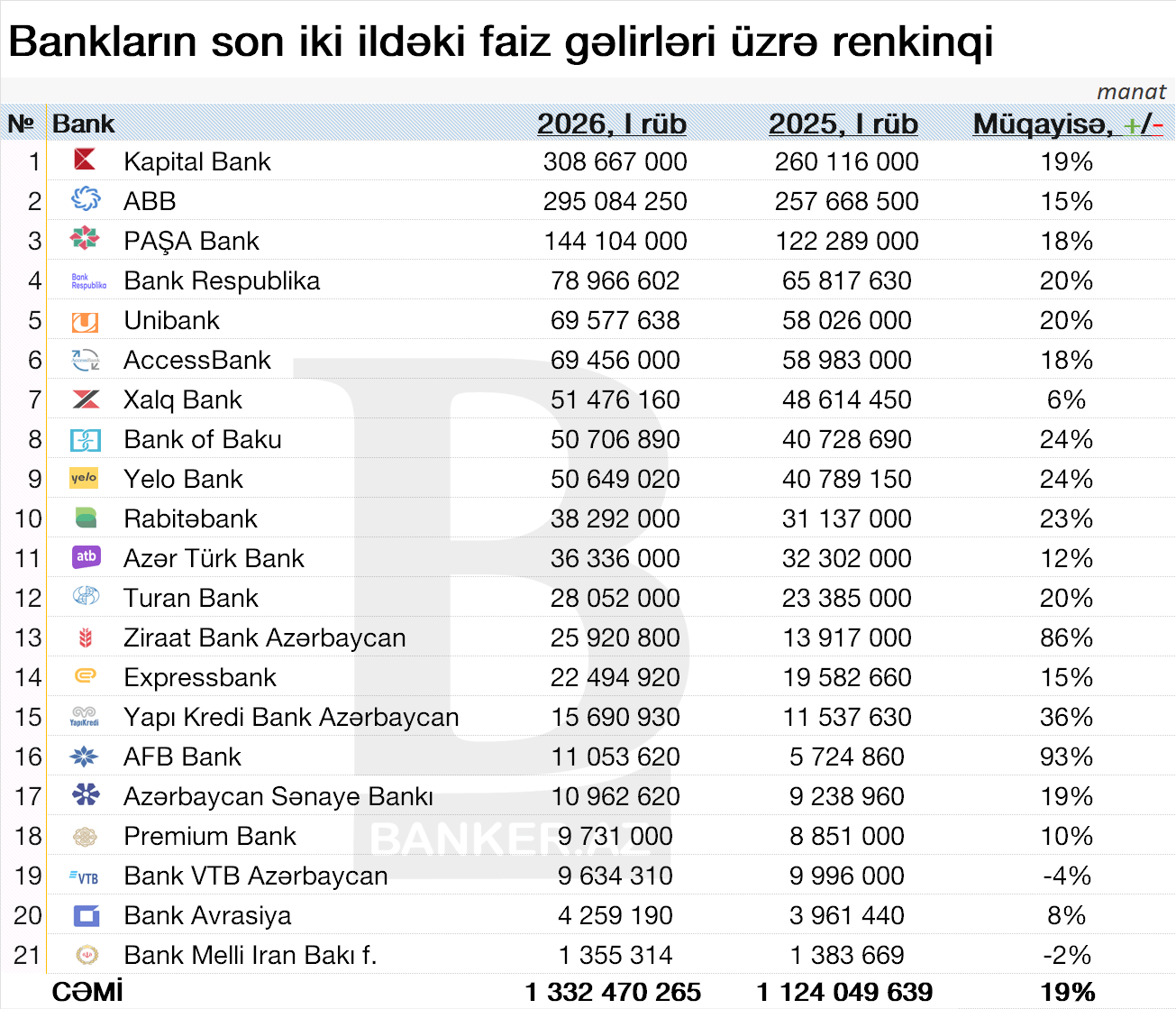 “Bank Respublika”, “Unibank” və “AccessBank” da müsbət dinamika nümayiş etdirərək müvafiq olaraq 20%, 20% və 18% artım qeydə alıblar. Bununla yanaşı, bəzi banklarda azalma müşahidə olunub. “Bank VTB Azərbaycan” üzrə faiz gəlirləri 4% azalıb, “Bank Melli İran” Bakı filialında isə 2% azalma qeydə alınıb.