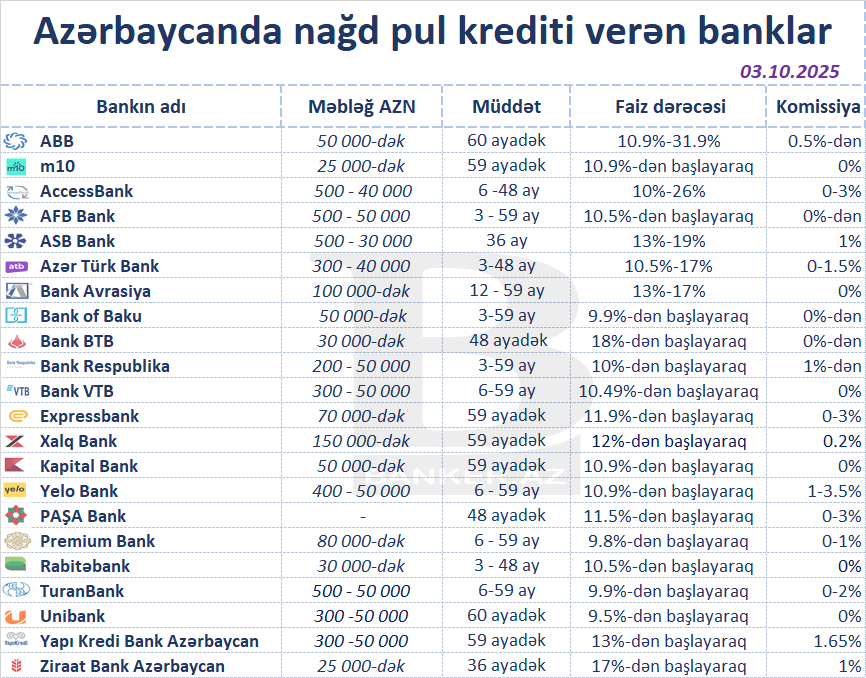Banker.az olaraq banklarda 2025-ci ilin sentyabr ayı üzrə nağd pul kreditinin şərtlərini araşdırıb.